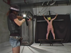 調教依頼が監督の所へ。完全奴隷女にしてくれということで首輪をして犬散歩・鞭打ち、そしてフェラ抜き。強制飲尿。こぼした床の小便も舐めてお掃除。茶碗に女ADが小便をし、ご飯を入れて小便茶漬け喰え!食べ残したのでお仕置き開始!両手吊り、一本鞭によるメッタ打ち。そしてトドメは数万ボルトのスタンガン責め。浣腸をし脱糞させクスコでアナル拡張。三穴FUCK、そして中出しザーメンに顔射を喰らわす。小便シャワーで綺麗に洗い流す。最後にエアガンとマシンガンで背中と尻が穴だらけ。家畜女は飼い主の依頼通り、無慚な奴隷女に。そして、ガンマニア必見。ガンで打たれてみたいドM女達をあらゆる飛び道具でメッタ打ち!阿鼻叫喚・地獄とはこんなものか。(天下無双)